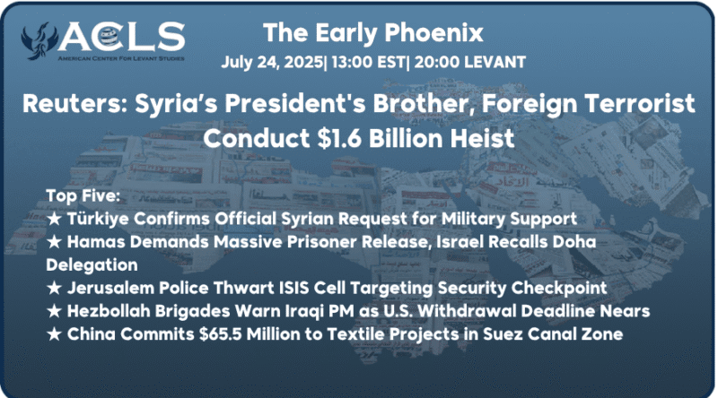 ★ Disclaimer: The Early Phoenix is a digest of various news sources compiled by the Early Phoenix team and edited by Rania Kisar. The items are curated, concise summaries of news items hyperlinked within each story. The items and summaries presented do not necessarily represent the views of the American Center for Levant Studies.