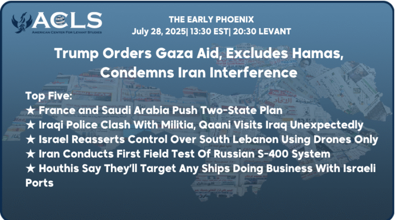 ★ Disclaimer: The Early Phoenix is a digest of various news sources compiled by the Early Phoenix team and edited by Rania Kisar. The items are curated, concise summaries of news items hyperlinked within each story. The items and summaries presented do not necessarily represent the views of the American Center for Levant Studies.
