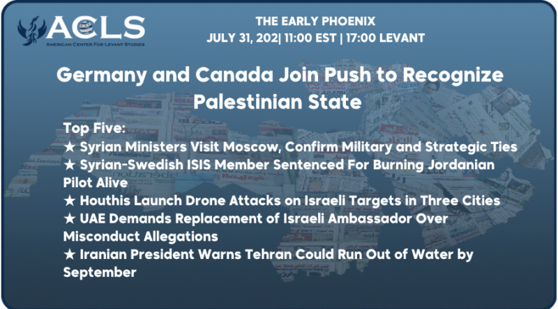 ★ Disclaimer: The Early Phoenix is a digest of various news sources compiled by the Early Phoenix team and edited by Rania Kisar. The items are curated, concise summaries of news items hyperlinked within each story. The items and summaries presented do not necessarily represent the views of the American Center for Levant Studies.