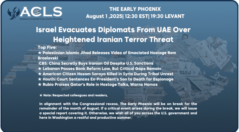 ★ Disclaimer: The Early Phoenix is a digest of various news sources compiled by the Early Phoenix team and edited by Rania Kisar. The items are curated, concise summaries of news items hyperlinked within each story. The items and summaries presented do not necessarily represent the views of the American Center for Levant Studies.
